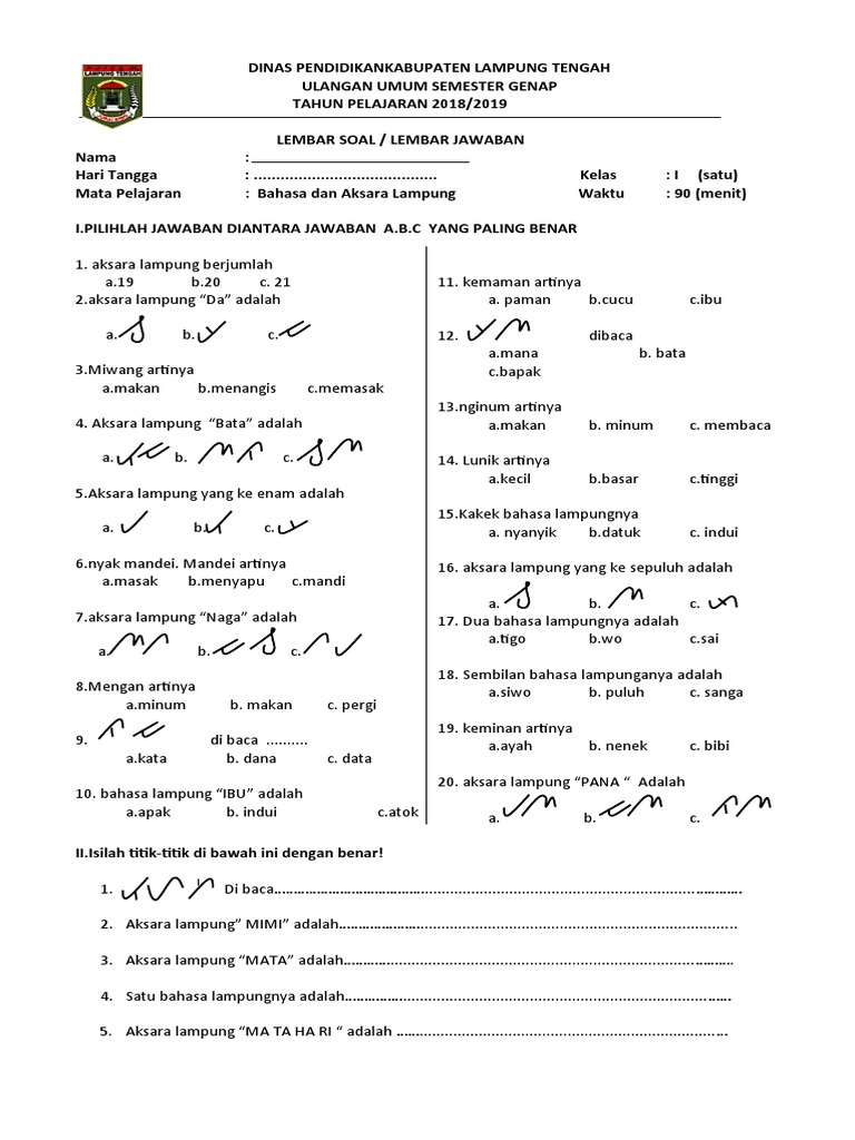 Bahasa Lampung adalah bagian tak terpisahkan dari kekayaan budaya Indonesia. Sebagai bahasa daerah, pelestarian dan pengembangannya menjadi tanggung jawab kita bersama, dimulai dari pengenalan sejak dini. Bagi siswa kelas 1 semester 2, pemahaman dasar bahasa Lampung menjadi fondasi penting untuk mengembangkan kemampuan berbahasa dan mencintai warisan budaya sendiri. Artikel ini akan menyajikan panduan lengkap latihan soal bahasa Lampung untuk kelas 1 semester 2, mencakup berbagai aspek penting dalam kurikulum.