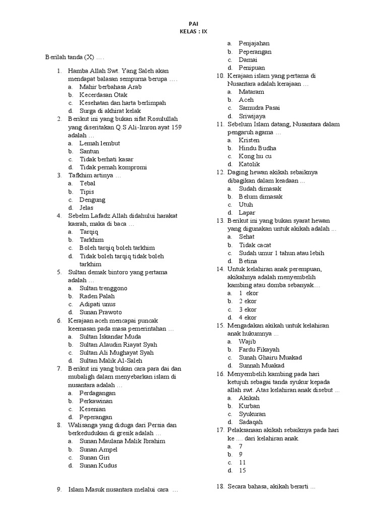 Pendidikan Agama Islam (PAI) merupakan mata pelajaran penting dalam kurikulum pendidikan di Indonesia, termasuk di tingkat SMP/MTs. Pemahaman yang baik terhadap materi PAI tidak hanya penting untuk bekal di dunia, tetapi juga sebagai landasan moral dan spiritual dalam menjalani kehidupan. Salah satu tahapan penting dalam proses pembelajaran PAI adalah evaluasi melalui ujian semester. Artikel ini akan menyajikan contoh-contoh soal PAI kelas 9 semester 2 yang disusun secara komprehensif, mencakup berbagai materi pokok, dan dilengkapi dengan pembahasan singkat. Tujuannya adalah untuk membantu siswa mempersiapkan diri menghadapi ujian semester dengan lebih baik.